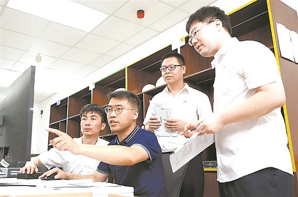 圖為張云龍(左二)正在與團隊成員研究北斗設備測試方案。李 菁 攝